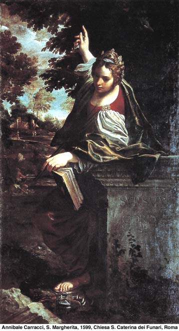 Por esta causa era aborrecida y maltratada por su padre idólatra y sacerdote de los ídolos, el cual llevó su inhumanidad hasta el extremo de acusarla y de ponerla en manos del impío presidente Olibrio. Habíase enamorado este tirano de la belleza de Margarita, y no pudiendo atraerla a su voluntad con astucia ni con fuerza, trocó todo el amor en odio, y quiso vengarse de ella con tormentos.