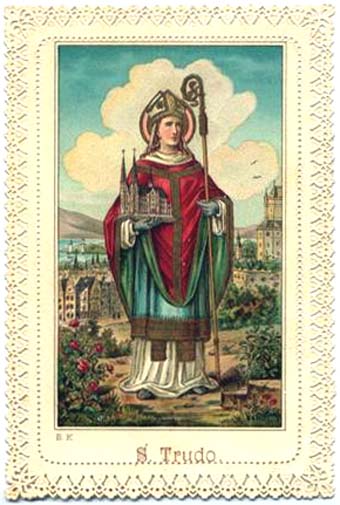En el siglo VII, había todavía muchos paganos en la región de Brabante (que coincide con parte de los actuales Países Bajos y Bélgica). En la zona de Hasbaye se venera a san Trudo especialmente, por el celo con que predicó allí el Evangelio. Sus padres eran francos. Trudo se consagró al servicio de la Iglesia, y san Remado le envió a la escuela catedralicia de Metz, donde fue ordenado por san Clodulfo. Después, volvió el santo a la región que le había visto nacer, y allí predicó el Evangelio a los paganos, y en sus posesiones construyó una iglesia y un monasterio. La actual Saint-Trond, entre Lovaina y Tongres, deriva su nombre de dicho monasterio. San Trudo fundó también un convento de religiosas en las cercanías de Brujas. Sobre su vida escribió el diácono Donato una biografía, menos de un siglo después de la muerte del santo, que es fidedigna en su conjunto. Sus reliquias se encuentran en un magnífico relicario decorado con escenas de su vida, en la Iglesia de Nuestra Señora, en Saint-Trond, Bélgica.