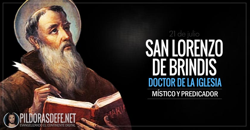 Fiesta: 21 de julioMartirologio romano: San Lorenzo de Brindis, presbítero y doctor de la Iglesia quien ingresó en la Orden de los Frailes Menores Capuchinos, ejerció sin descanso en las regiones de Europa, el ministerio de la predicación. Cumplió cada asignación con sencillez y humildad en la defensa de la Iglesia contra los infieles, para reconciliar entre sí a los poderosos reinados que se encontraban enfrentados, cuidando con gran celo el gobierno de su Orden. Murió el 22 de julio murió en Lisboa, Portugal.Biografia de San LorenzoPerdió a su padre cuando era niño y su madre cuando llegó a ser un adolescente. A los 14 años se trasladó a Venecia por orden de un tío que era sacerdote, donde continuó sus estudios y desarrolló la vocación a la Orden de los Capuchinos. Tomó el nombre de Lorenzo cuando se hizo franciscano capuchino a la edad de 16. Después de su ordenación, el 18 de diciembre 1582, San Lorenzo llega a ser un predicador muy popular y muchos le tenían gran admiración debido a la poderosa fuerza que le imprimía en sus homilías. Como el podía hablar en hebreo, esto le sirvió para trabajar en la conversión de los Judios que vivían en Roma. Fundador, misionero y guerreroEn el año de 1596, San Lorenzo de Brindis se convirtió en superior de su orden y cinco años más tarde fue enviado a Alemania con el Beato Benito de Urbino para llevar la Palabra de Dios en sus predicaciones. Allí fundaron varios conventos, y luegos fundaron muchos más en toda Europa.San Lorenzo de Brindis también colaboró convenciendo a muchos a alistarse en el ejército para luchar contra los turcos en Hungría, donde ganó una batalla contra ellos de forma milagrosa. Él condujo a los soldados a la batalla con solamente un crucifijo para protegerse. En 1602, San Lorenzo de Brindis se convirtió en el maestro general de su orden. Trabajó, predicó y escribió muchas interpretaciones y difundió la Buena Nueva. Él continuó su tarea de misionero por la paz en muchos lugares importantes como Munich, Alemania, y en Madrid, España. Los gobernantes de esos lugares lo escuchaban y quedaban completamente admirados y convencidos de sus palabras. Sus misiones allí fueron un éxito total. Su muerteSan Lorenzo de Brindis sentía la cercanía de su muerte, el comenzó a sentir un gran debilitamiento en su cuerpo debido a los duros viajes de las misiones que emprendía y por todo el estrés de sus tareas.Su cuerpo se enfermó grávemente. Murió el mismo día de su cumpleaños, el 22 de julio, en 1619. Fue proclamado santo por el Papa León XIII en 1881. Él fue honrado como "Doctor de la Iglesia" por el Papa Juan XXIII en 1959. San Lorenzo de Brindis fue el primero de los Capuchinos en ser honrado como un Doctor de la Iglesia. Al igual que su padre espiritual, San Francisco de Asís, tuvo una ardiente devoción a la Inmaculada Madre de Dios. Fue el primero en escribir sobre todos los aspectos de la teología que se refieren a laSantísima Virgen. En la práctica de las virtudes religiosas de San Lorenzo de Brindis es igual a los más grandes santos. Tenía el don de la contemplación y la frecuencia cayó en éxtasis cuando se celebró la Santa Misa. Tenía una gran devoción por el Santo Rosario y por la Santísima Virgen María. Sus obras escritas incluyen algunas piezas polémicas contra los luteranos y un comentario sobre el Génesis, pero sus principales aportaciones se encuentran en los nueve volúmenes de sus sermones.